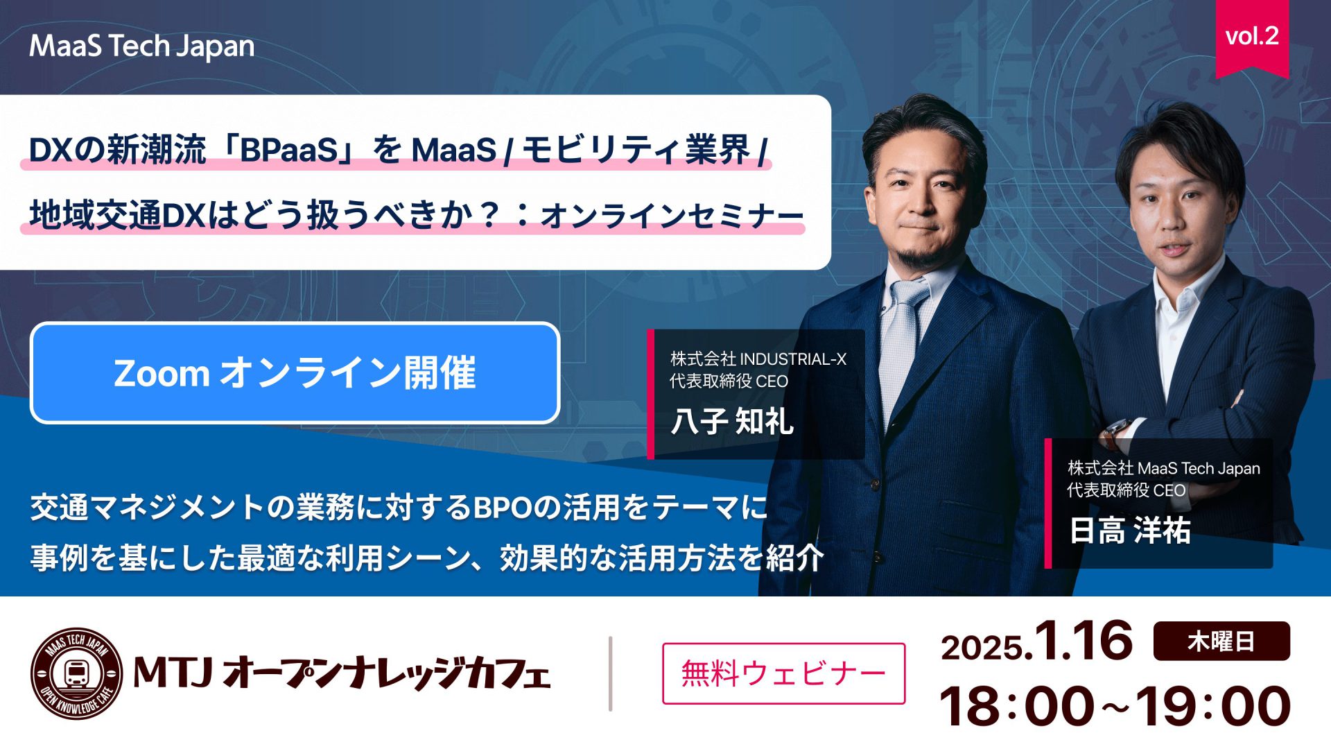 未来の理想的な移動社会の基盤構築を支援する株式会社MaaS Tech Japan (以下「MTJ」)は、地域交通やMaaSなど交通業界に関する話題を取り上げるセミナーシリーズ『MTJオープンナレッジカフェ』第2回目として2025年1月16日(木)18:00より、交通マネジメント業務に対するBPaaS(Business Process as a Service)の活用に関し、【DXの新潮流「BPaaS」をMaaS/モビリティ業界/地域交通DXはどう扱うべきか?】と題し、オンライントークセッションを開催することをお知らせいたします。DXの新潮流とされるBPaaSについて、同領域に精通する株式会社INDUSTRIAL-X(以下「INDUSTRIAL-X」)代表取締役CEOの八子氏をお招きし、MTJ代表の日高とともに、活用事例を交えながら最適な利用シーンやユースケース、効果的な取り入れ方について深掘りしてまいります。参加無料です。
