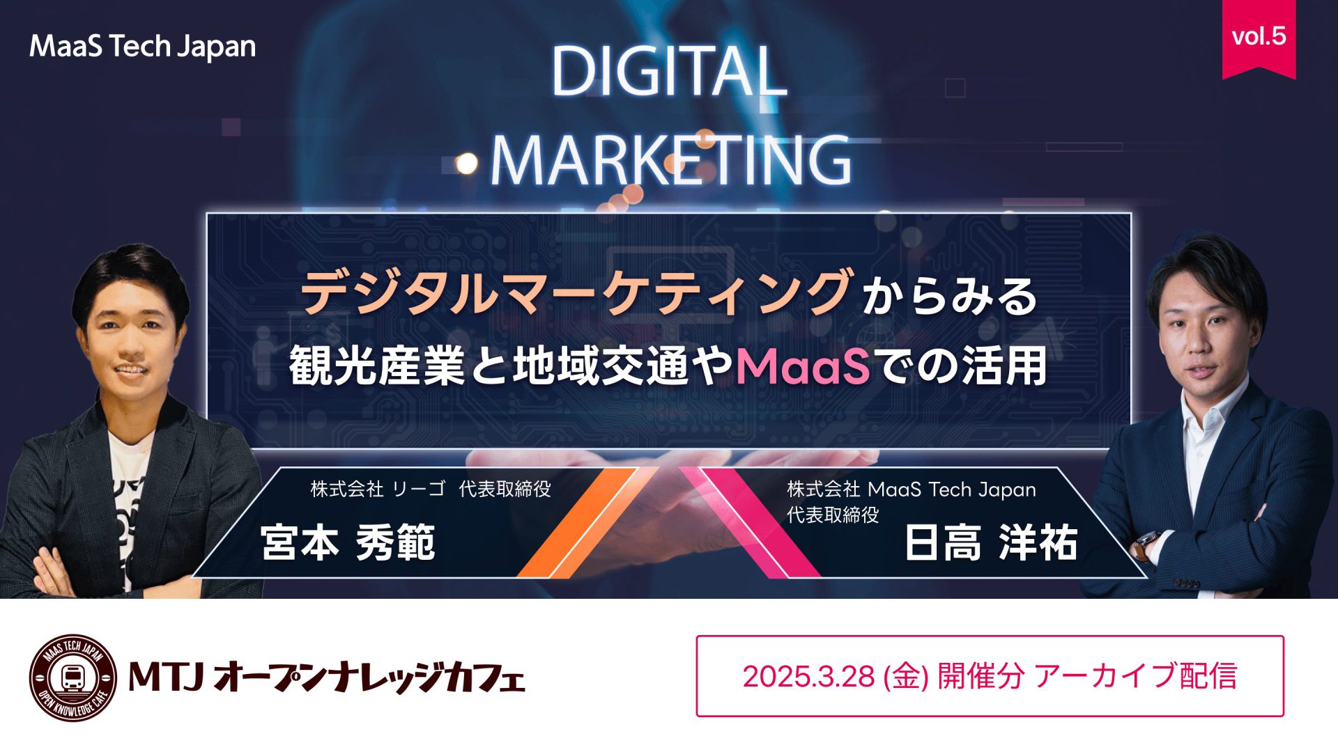 当日は、宮本氏からこれまでの取り組み事例などを交えながら、デジタルマーケティングから見る観光産業の現状と理想像について解説いただきます。あわせてMaaS領域のフロントランナーとして活動するMTJ代表 日高も登壇し、旅行や観光と密接に関わるMaaSや地域交通に絡めながら、今度どのように活用や連携が広がっていくのかに関する可能性やアイデアについて深掘りしていきます。